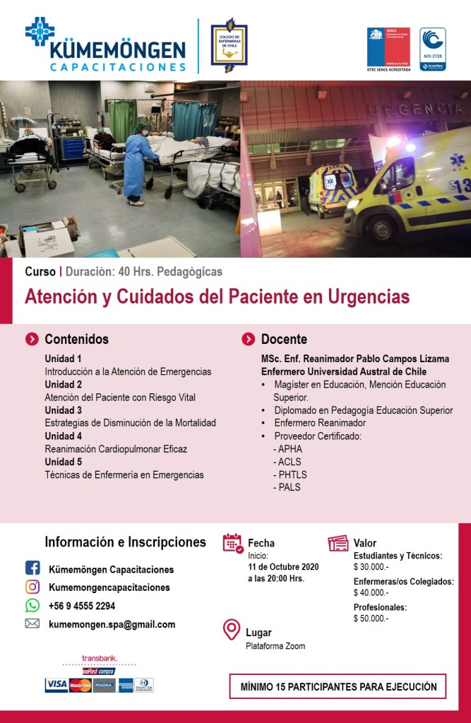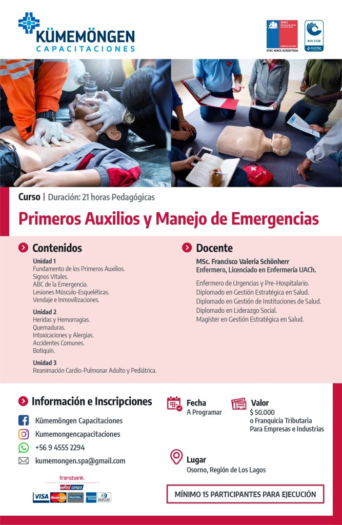 Curso que dentro de sus objetivos está el adquirir, fortalecer y aplicar conocimientos sobre primera atención de salud y situaciones de emergencia a través de la correcta implementación y ejecución de técnicas basadas en el manejo de primeros auxilios.